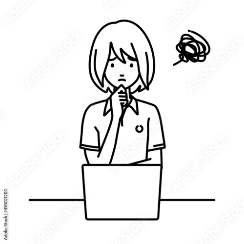 デスクで座ってPCを開いて困っているポロシャツの女性