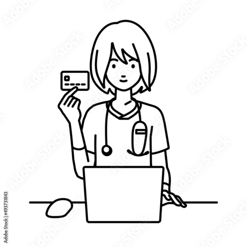 credit card, payment, card, business, convenient, clearing, nurse, nurse, doctor, hospital, work, possess, finance, diagnosis, stethoscope, medical care, desk, work, notebook, white background, cut-out, illustration, vector, white, flat, mouse, table, web, web, cyberspace, technology, people, woman, woman, front, waist up, emergency, uniform, labcoat, clinic, hospitalise, exam, black-and-white