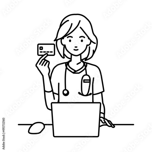 デスクで座ってPCを使いながらクレジットカードを手に持っている看護師の女性