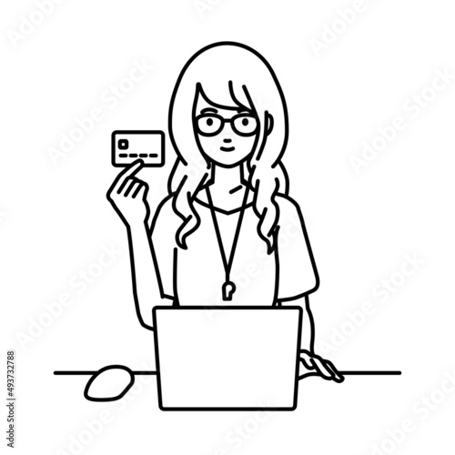デスクで座ってPCを使いながらクレジットカードを手に持っている教師の女性
