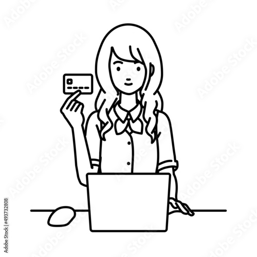 デスクで座ってPCを使いながらクレジットカードを手に持っている事務員制服の女性