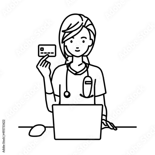 デスクで座ってPCを使いながらクレジットカードを手に持っている看護師の女性