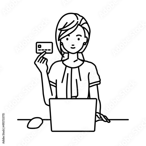 デスクで座ってPCを使いながらクレジットカードを手に持っているオフィスカジュアルの女性
