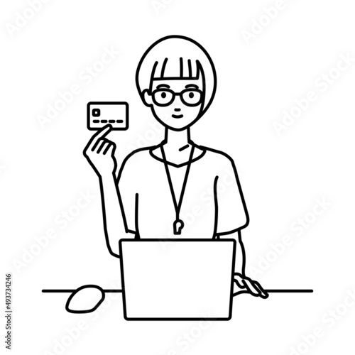デスクで座ってPCを使いながらクレジットカードを手に持っている教師の女性
