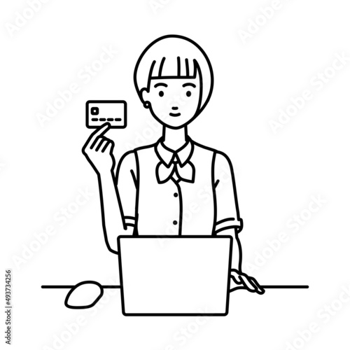 デスクで座ってPCを使いながらクレジットカードを手に持っている事務員制服の女性