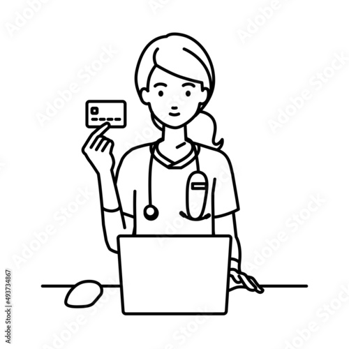 デスクで座ってPCを使いながらクレジットカードを手に持っている看護師の女性