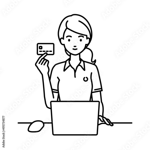 デスクで座ってPCを使いながらクレジットカードを手に持っているポロシャツの女性