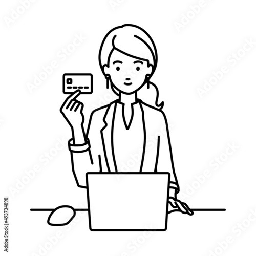 デスクで座ってPCを使いながらクレジットカードを手に持っているジャケットの女性