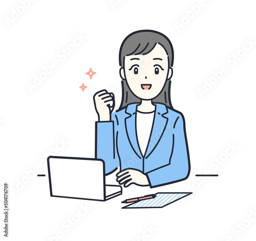 ガッツポーズをするPCを操作しているスーツの女性会社員のイラスト素材