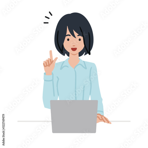 デスクで座ってPCを開いて何かひらめいたブラウスの女性