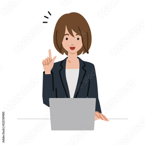 デスクで座ってPCを開いて何かひらめいたスーツの女性