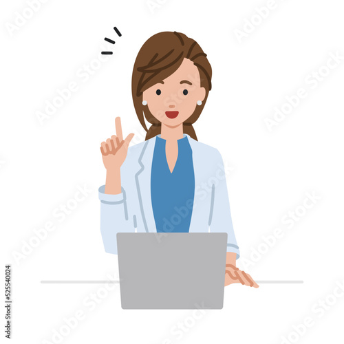 デスクで座ってPCを開いて何かひらめいたジャケットの女性