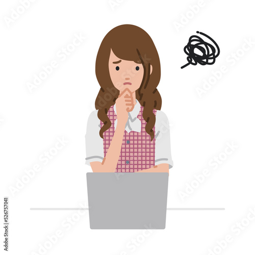 デスクで座ってPCを開いて困っている事務員制服の女性