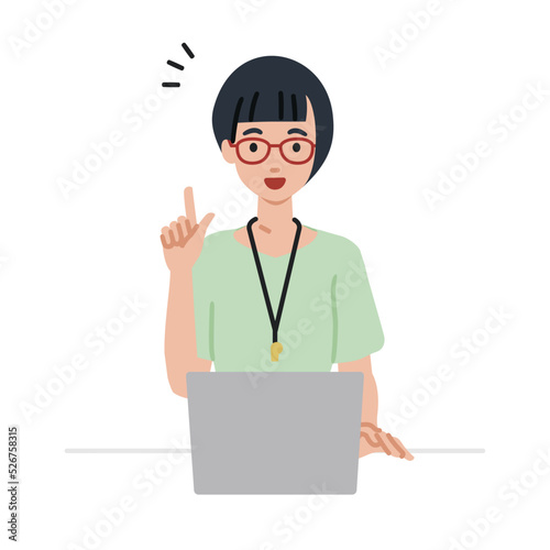 デスクで座ってPCを開いて何かひらめいた教師の女性