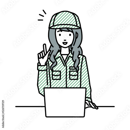 デスクで座ってPCを開いて何かひらめいた作業員の女性