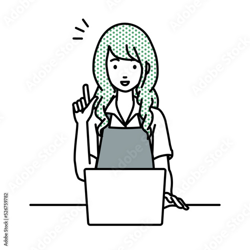 デスクで座ってPCを開いて何かひらめいた店員の女性