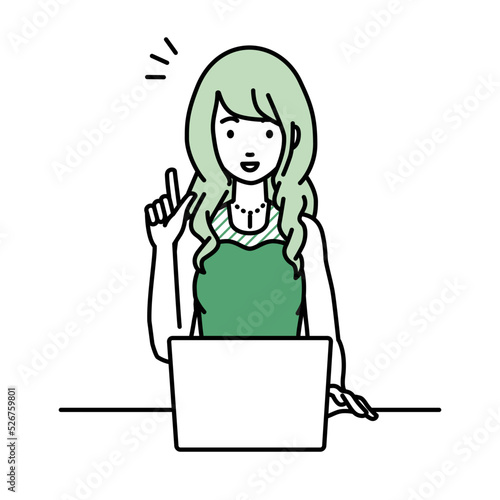 デスクで座ってPCを開いて何かひらめいたドレスの女性