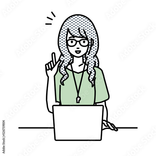 デスクで座ってPCを開いて何かひらめいた教師の女性