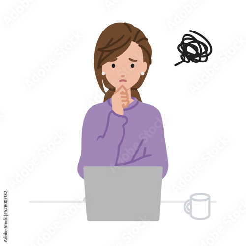 デスクで座ってPCを開いて困っているリモートワークの女性