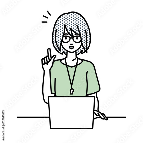 デスクで座ってPCを開いて何かひらめいた教師の女性