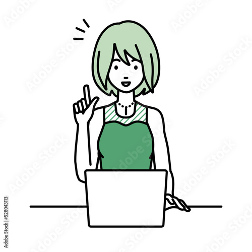 デスクで座ってPCを開いて何かひらめいたドレスの女性