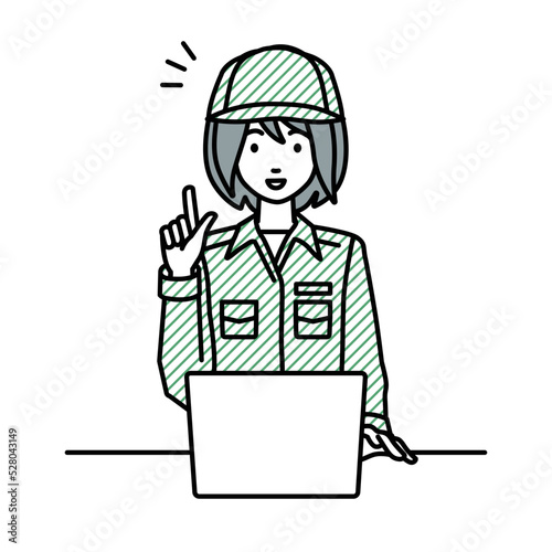 デスクで座ってPCを開いて何かひらめいた作業員の女性