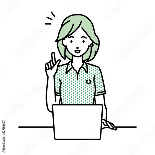 デスクで座ってPCを開いて何かひらめいたポロシャツの女性