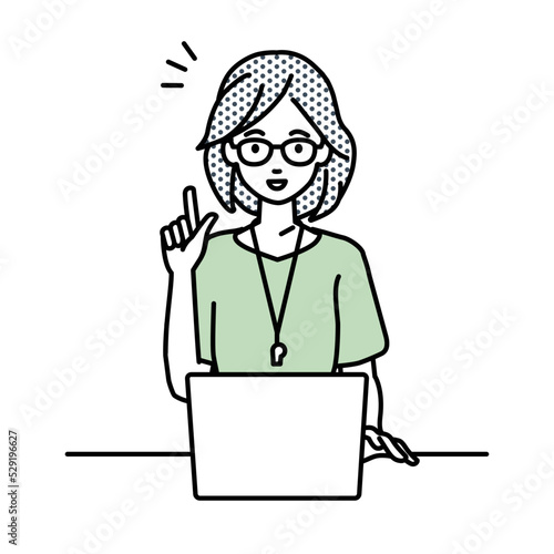 デスクで座ってPCを開いて何かひらめいた教師の女性