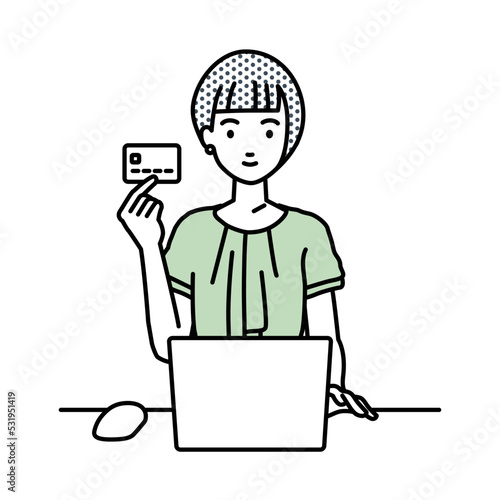 デスクで座ってPCを使いながらクレジットカードを手に持っているオフィスカジュアルの女性