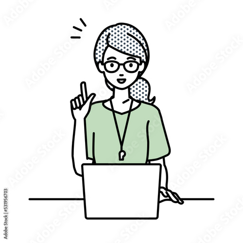 デスクで座ってPCを開いて何かひらめいた教師の女性