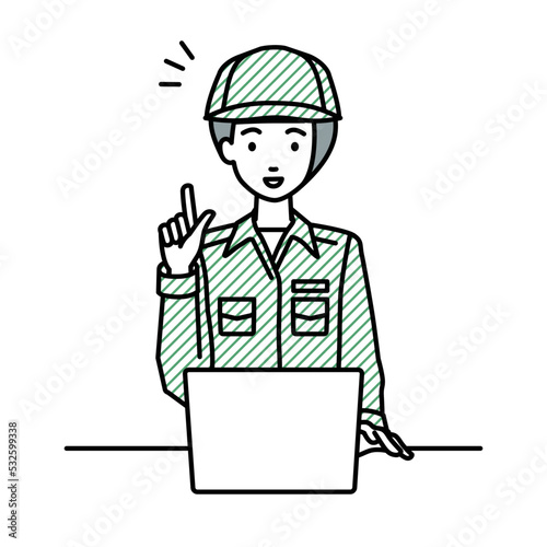 デスクで座ってPCを開いて何かひらめいた作業員の女性