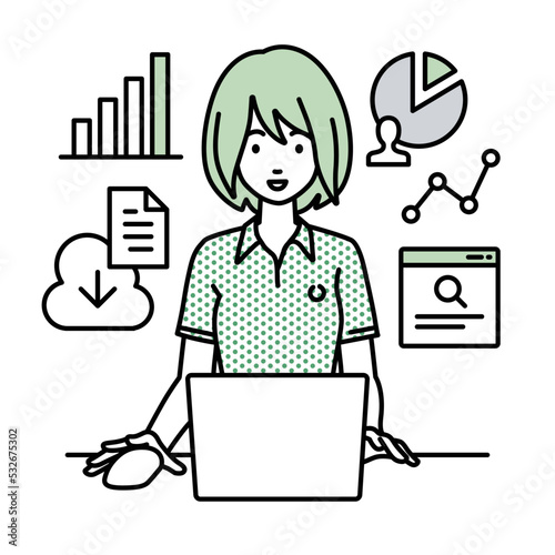 デスクでPCを前にリサーチ・データ分析・レポート作成をしているポロシャツの女性