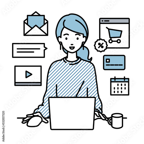 デスクで座ってPCでネットショップやマーケティングの仕事をしているリモートワークの女性