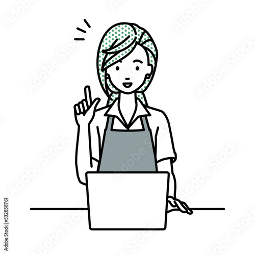 デスクで座ってPCを開いて何かひらめいた店員の女性