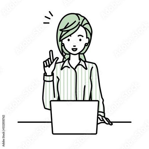 デスクで座ってPCを開いて何かひらめいたブラウスの女性