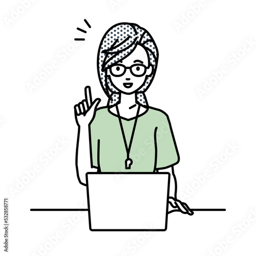 デスクで座ってPCを開いて何かひらめいた教師の女性