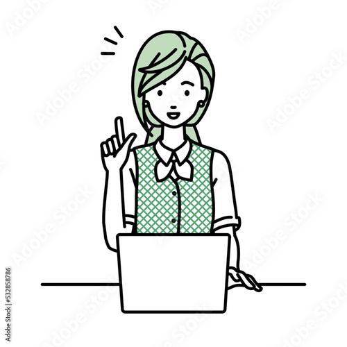 デスクで座ってPCを開いて何かひらめいた事務員制服の女性