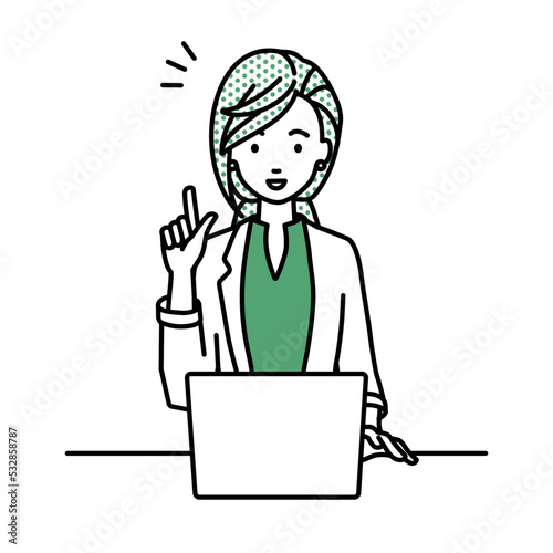 デスクで座ってPCを開いて何かひらめいたジャケットの女性