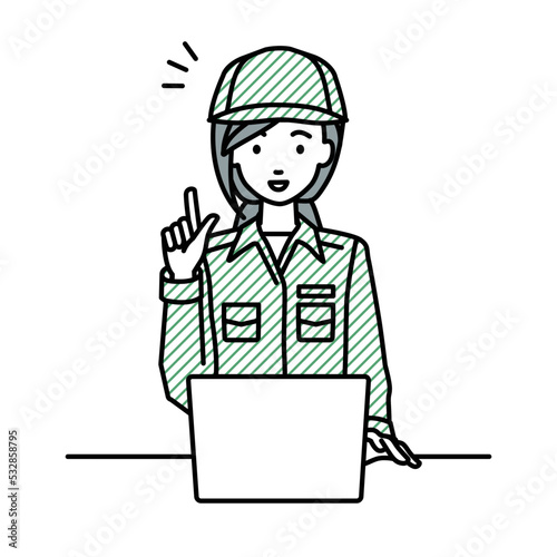 デスクで座ってPCを開いて何かひらめいた作業員の女性