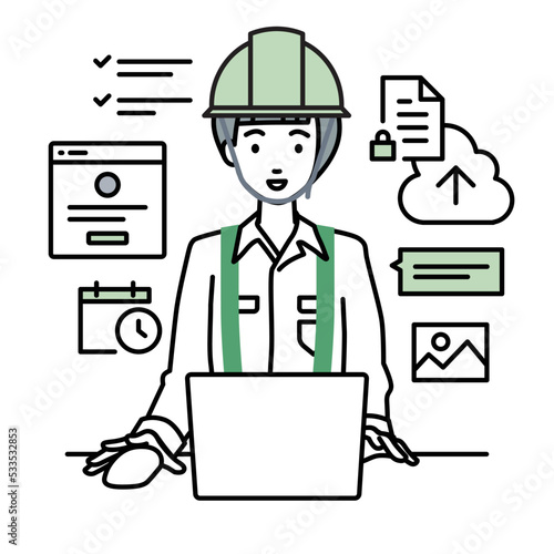 デスクで座ってPCでプロジェクトやタスクの管理の仕事をしている工事現場の女性