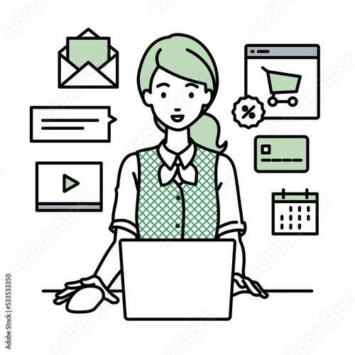 デスクで座ってPCでネットショップやマーケティングの仕事をしている事務員制服の女性