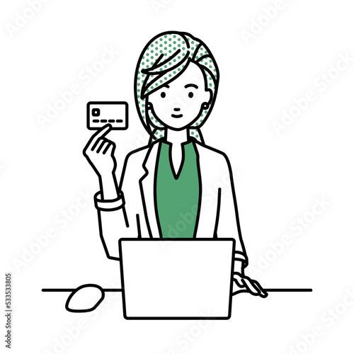 デスクで座ってPCを使いながらクレジットカードを手に持っているジャケットの女性
