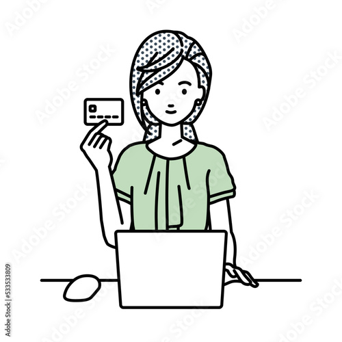 デスクで座ってPCを使いながらクレジットカードを手に持っているオフィスカジュアルの女性