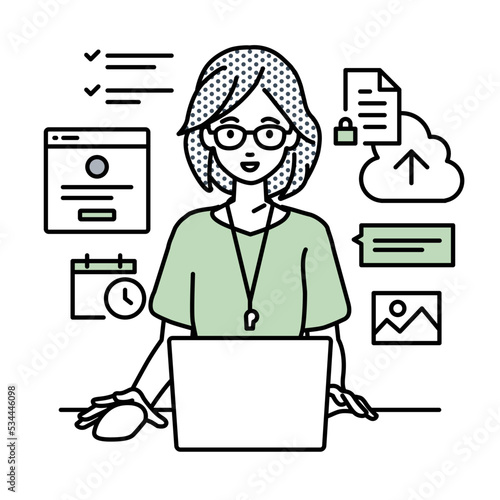 デスクで座ってPCでプロジェクトやタスクの管理の仕事をしている教師の女性