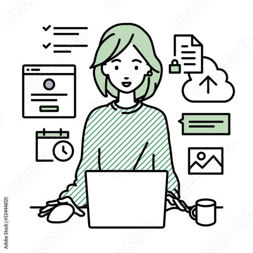 デスクで座ってPCでプロジェクトやタスクの管理の仕事をしているリモートワークの女性