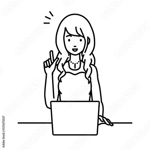 デスクで座ってPCを開いて何かひらめいたドレスの女性