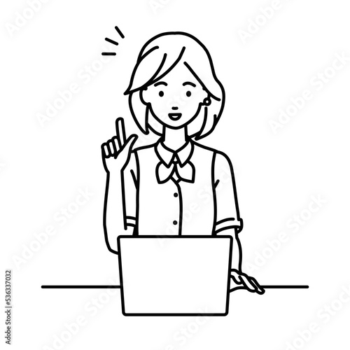 デスクで座ってPCを開いて何かひらめいた事務員制服の女性