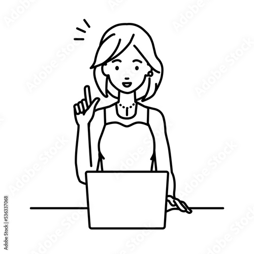 デスクで座ってPCを開いて何かひらめいたドレスの女性