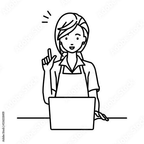 デスクで座ってPCを開いて何かひらめいた店員の女性