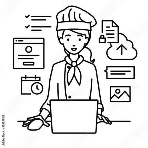 デスクで座ってPCでプロジェクトやタスクの管理の仕事をしている調理師の女性